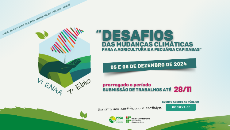 A equipe organizadora do VI Encontro Anual de Agroecologia e do VII Encontro de Ciências Biológicas informa que o prazo para submissão de trabalhos foi prorrogado até o dia 28 de novembro de 2024. Aproveite essa oportunidade para compartilhar suas pesquisas e experiências no evento que abordará o tema Desafios das mudanças climáticas para a agricultura e a pecuária capixabas.