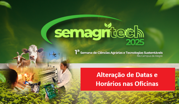 A Comissão Organizadora da I Semana de Ciências Agrárias e Tecnologias Sustentáveis (SEMAGRITECH) do Ifes - Campus de Alegre informa que ocorreram alterações nas datas e/ou horários de algumas oficinas.