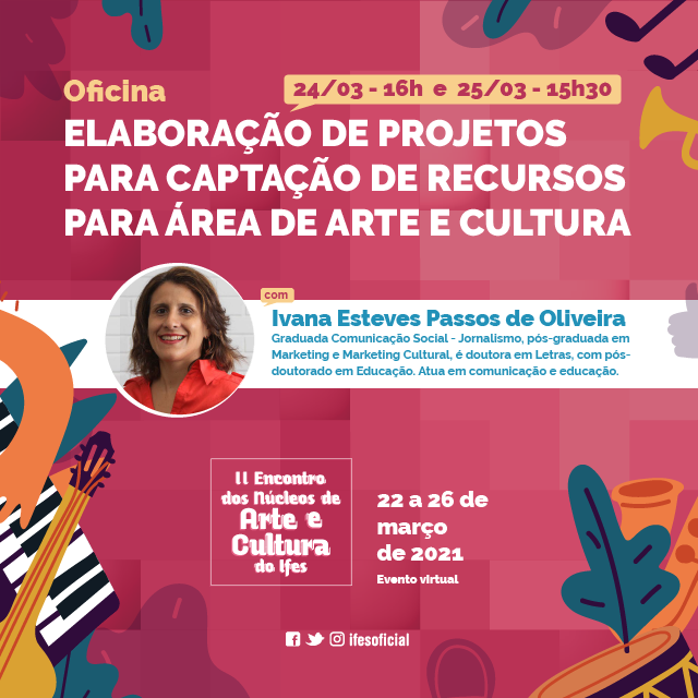 A Oficina de elaboração de projetos para captação de recursos para área de arte e cultura será ministrada por Ivana Esteves Passos de Oliveira.