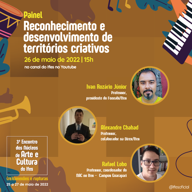 O Painel Reconhecimento e desenvolvimento de territórios criativos terá como convidados: Alexandre Chahad (Professor EBTT e Colaborador na Direx), Ivan Almeida Rozario Júnior (Professor EBTT e Presidente do Foneabi) e Rafael Lobo (Professor EBTT e Coordenador do NAC Campus Guarapari).