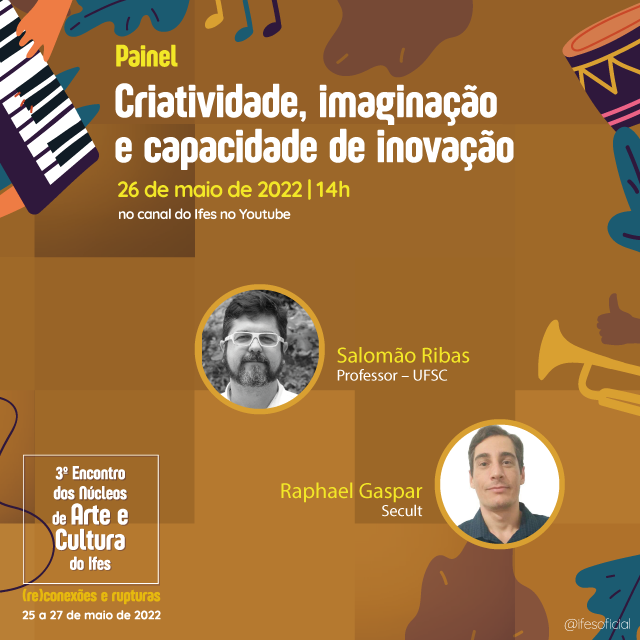 A mesa-redonda "Criatividade, imaginação e capacidade de inovação" será composta por Salomão Ribas (Professor Associado da UFSC) e Raphael Gaspar (Coordenador adjunto do Projeto Hub Criativo Virtual - Secult) e mediada por Leonardo Lopes (Agência de Economia Criativa Experimental - Agecx/Ifes)